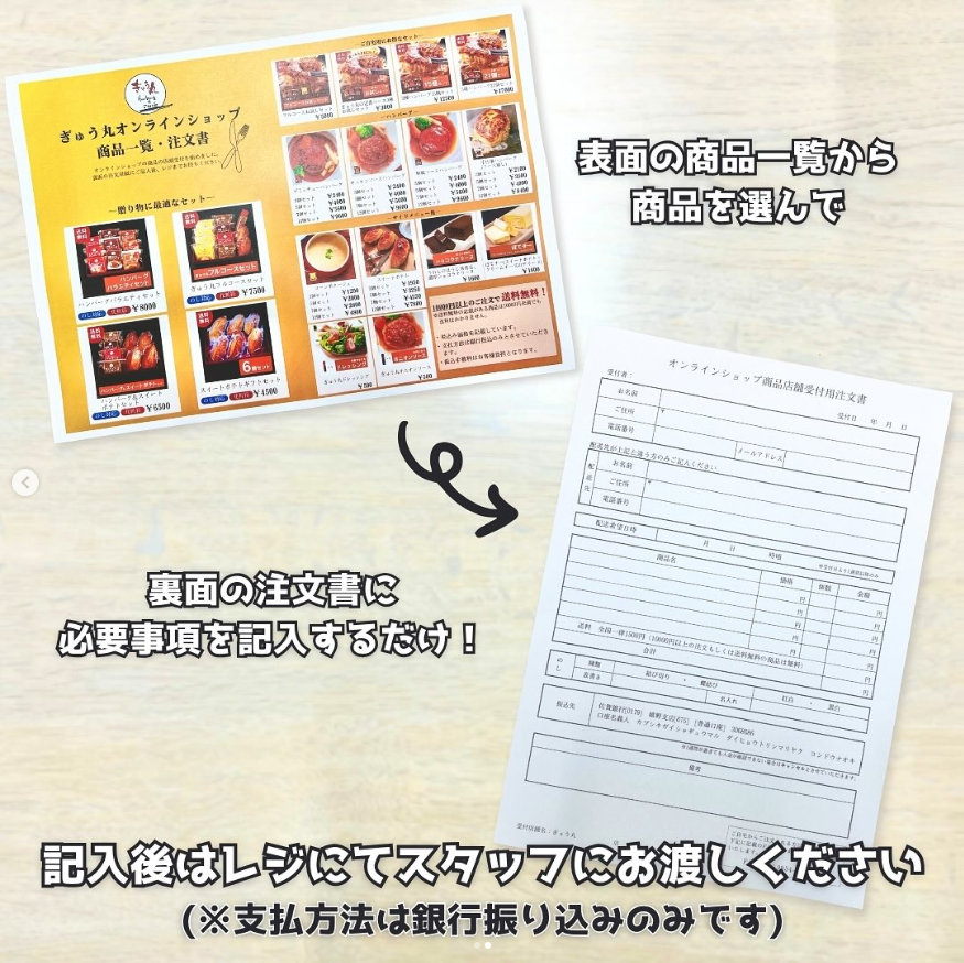 直営店では「ぎゅう丸オンラインショップ商品一覧・注文書」を置いています。