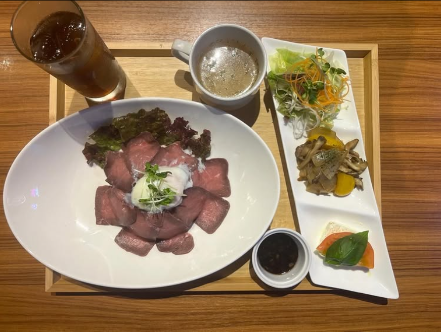 ローストビーフ丼はとろけるローストビーフに半熟卵をからめ、特製ソースで仕上げた贅沢な1品です🍴🤍゛