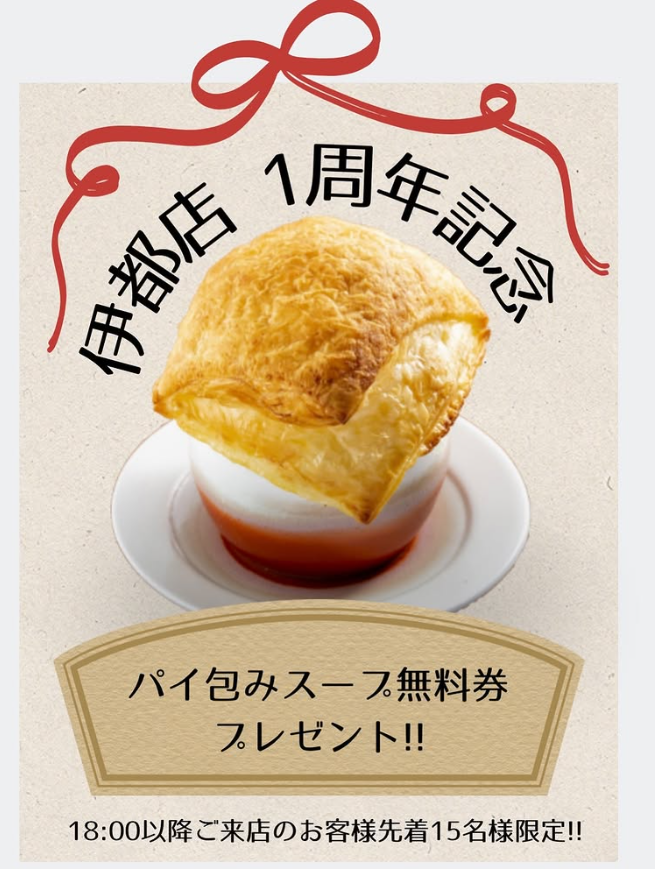 🎉伊都店1周年記念🎉夜限定キャンペーン開催中🌙18時以降ご来店で「パイ包みスープ無料券」プレゼント🎁